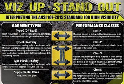 The ANSI/ISEA 107 American National Standard for High Visibility Safety Apparel and Accessories is a voluntary standard with guidelines that provide practical instruction regarding both reflective material and garment design to enhance worker visibility. ANSI/ISEA 107 presents three performance classes of garments and identifies garment types based on expected use settings and work activities being performed. These are designated as off-road (type O), roadway and temporary traffic control (type R), or public safety activities (type P).