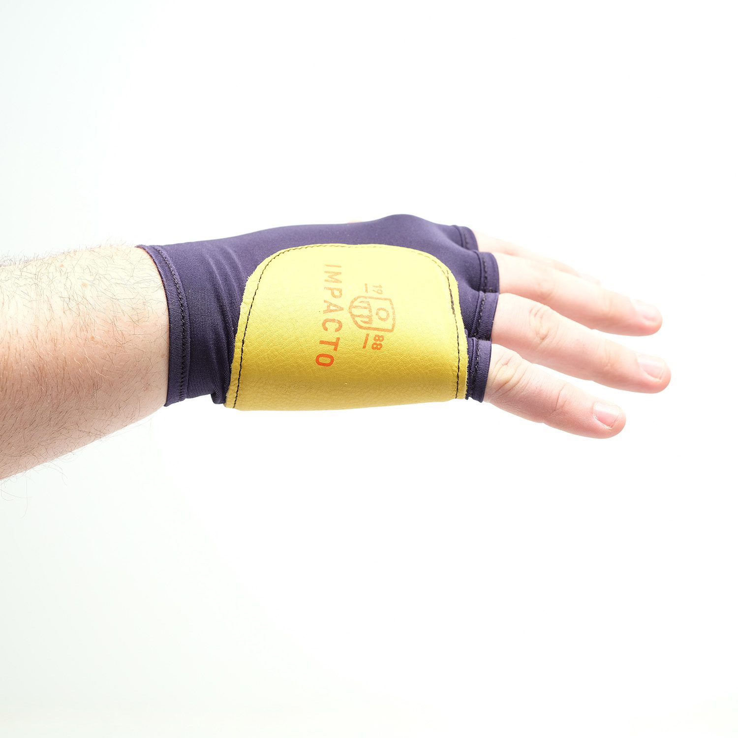 IMPACTO Fingerless Nylon Lycra® glove with grain leather and 1/8 inch impact absorbing VEP padding on the palm, edge and back of hand. Typically used in automotive and assembly for tasks where the hand is used as tool. Trim, moulding, windshield trim and headliner installation, urethane seal, door panel installation, provides cushioning, impact, abrasion and bruising protection. Viscolas VEP (1/8″/ 3 mm) padding offers excellent impact protection.