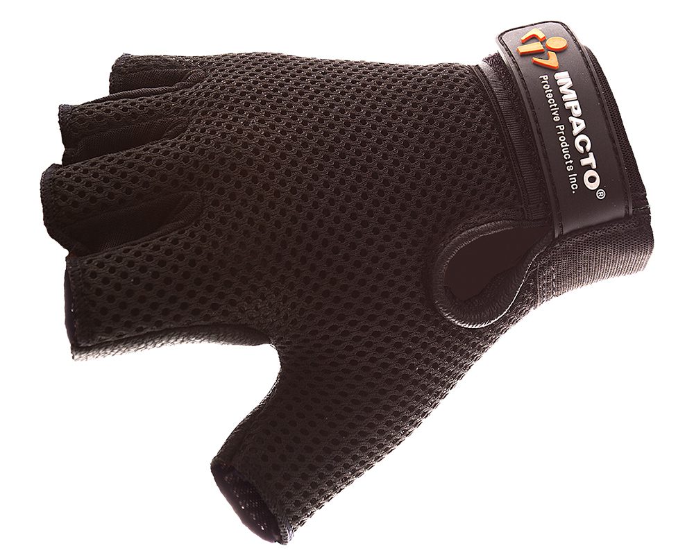 IMPACTO ST8610 Half Finger Carpal Tunnel Glove. Unique channel over the carpal tunnel keeps pressure off the median nerve. Visco-elastic polymer (VEP) padding in the palm absorbs and dampens impact. Thin, snug fitting pad is precision-cut eliminating bunching. Air mesh back. Finger gussetted for comfort. Hook and loop wrist closure. Durable black leather palm. Available in sizes: Small – 3XL. *For Carpal Tunnel Gloves order one size larger than your normal glove size. Larger sizes are custom and are available as requested.