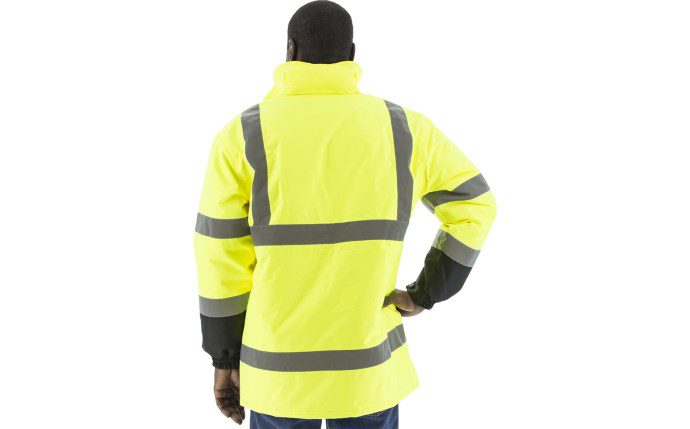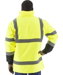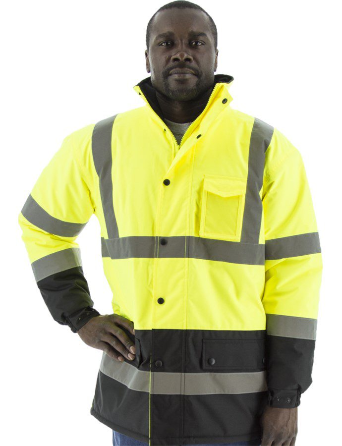 - Cold weather high visibility yellow/black parka designed to keep out the wet and cold