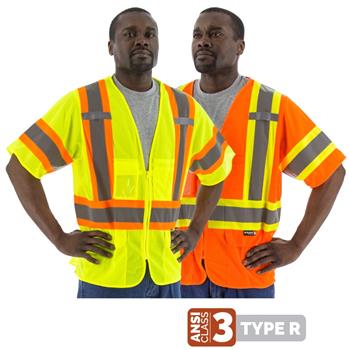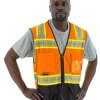 Majestic High visibility yellow or orange polyester mesh vest. Â Fabric is excellent for warm days. Â Zipper front closure with DOT reflective striping and Includes two radio pockets with ID badge display, pen pockets, and generous waist pockets. Â Side zippers allow relief from binding while sitting down. Â Meets ANSI/ISEA 107-2015 Class 3, Type R Standard