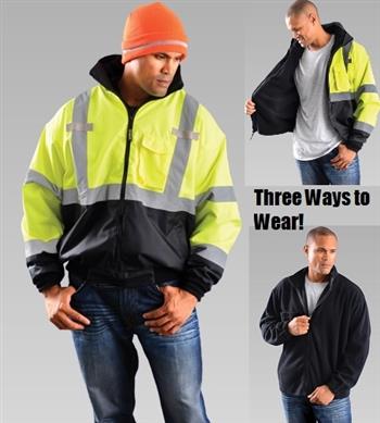 OccuNomix LUX-ETJBJR Classic Three-Way Hi Vis Black Bottom Bomber Jacket, ANSI Class 3, Waterproof, Black Fleece Liner, 3-in-1, Temperature Range 27.5° to 5° F, Hi Vis Yellow & Black
