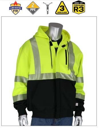 PIP 385-1370FR Type R Class 3 AR/FR Full Zip Hooded Sweatshirt 19.2 Cal NFPA 70E Hi Vis Yellow, Black Bottom