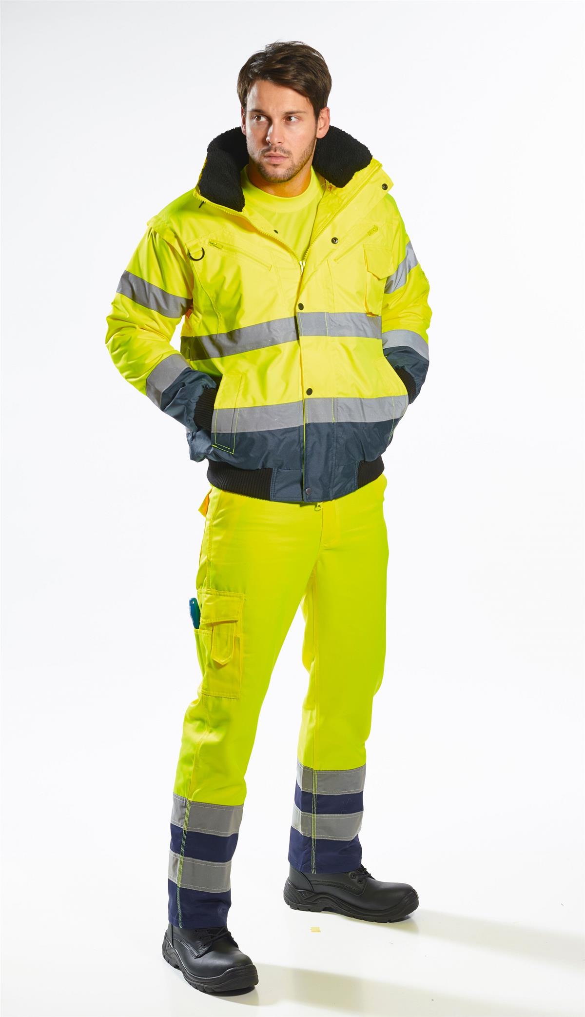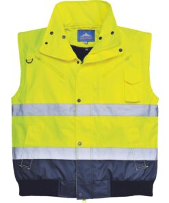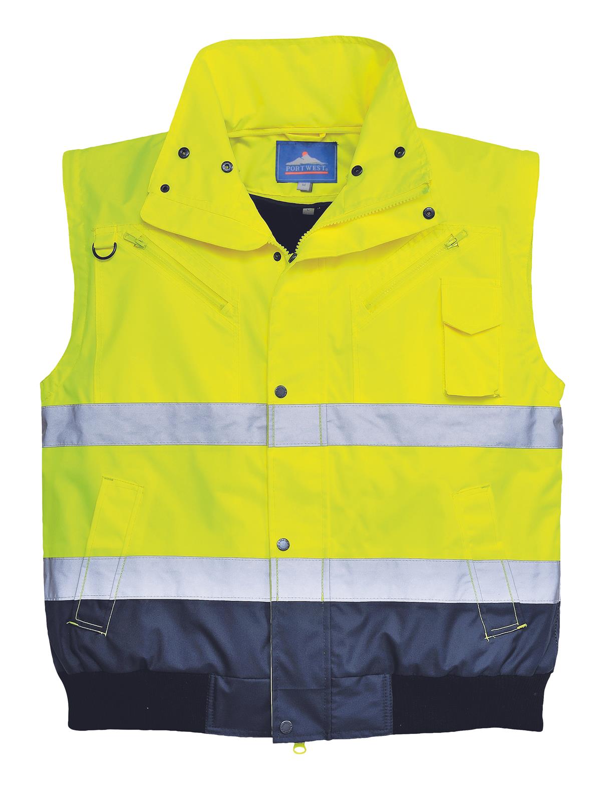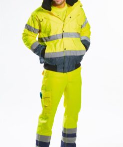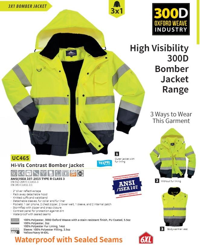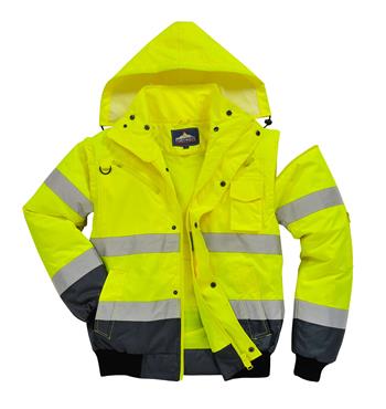 PortWest UC465 Hi Vis Yellow 3-in-1 Class 3 Contrast Bomber Jacket, Waterproof, Removable Sleeves, Fur Collar & Liner