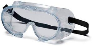 Chemical splash goggle features vent caps to restrict influx of liquids. Lenses provide 99% protection against harmful UV rays.