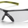 Contemporary metal frame and temples adjust to all facial sizes. Spring loaded temples make this eyewear easy to position. 9.75 base curved lens provides full side protection.