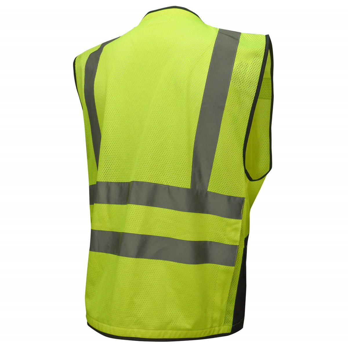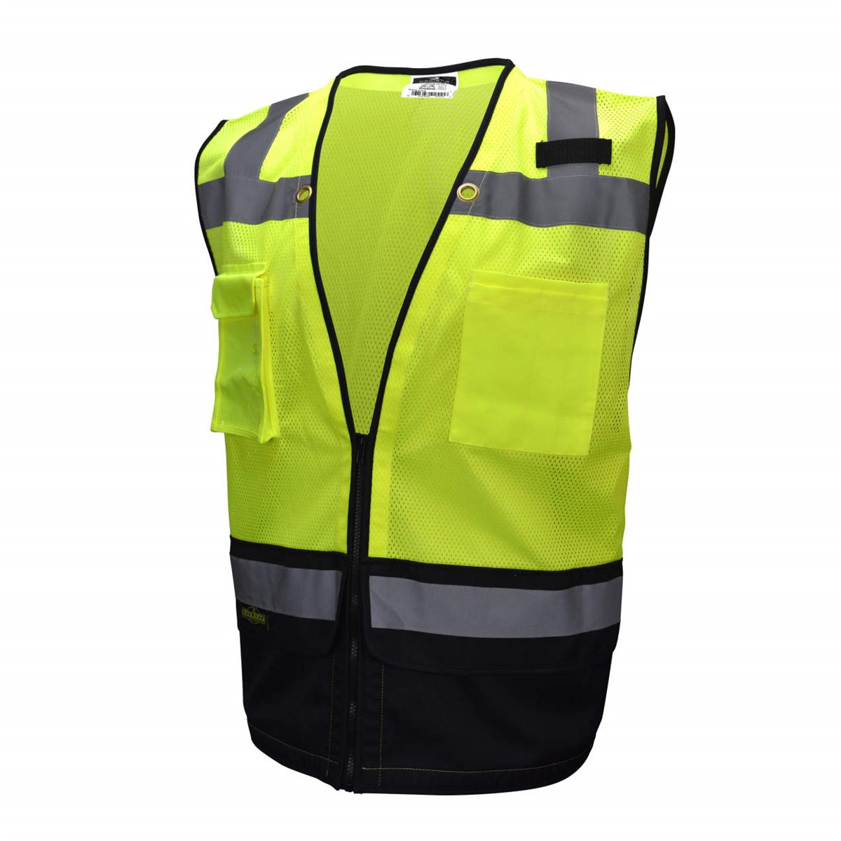 Radians SV59B Type R Class 2 Heavy Duty Surveyor Safety Vest Hi Vis Lime Green Black Bottom Front is a heavy duty contractor surveyor’s vest with zipper closure and large back “plan” pocket. Built with rugged ANSI 107 hi-vis material, reinforced wear points, and long-wearing web reinforcement along outer edges. Mesh upper, front and back, for breathability and comfort. Pockets in tough woven twill fabric provide maximum durability.