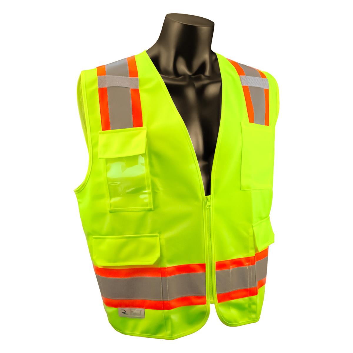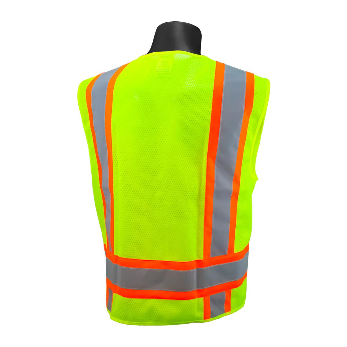 Radians SV6 Two Tone Surveyor Class 2 safety vest with solid front and mesh back, features multiple pocket configuration and contrasting trim on reflective stripes. Perfect to wear in daytime conditions. Contrast trim combinations make workers much more noticeable in low light and broad daylight.