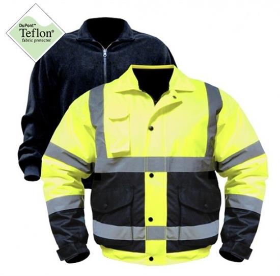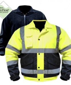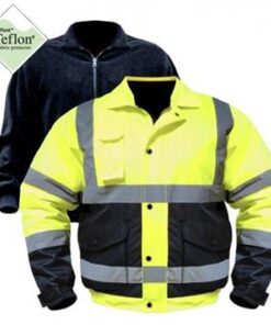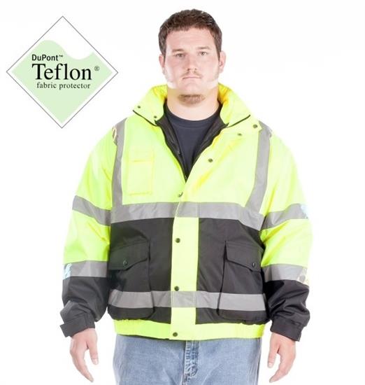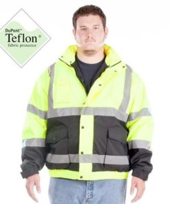 ANSI class 3 mens high visibility bomber jacket with zip-out storm fleece liner. Nylon shell infused with DuPont Teflon® fabric protector. Bellow pockets with side entry. Hidden hood. Nylon quilted lining with zip out storm fleece. Black bottom and sleeve helps protect the garment against wear and tear keeps the garment stay cleaner longer.