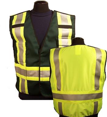 Vinatronics ANSI 207 Class 2 Pro’s Choice Multi-Color, 5-pt Break-Away Public Safety Vest w/ Snap Up Adjustable Length, Green. Green Cotton Front w/ Yellow Striping & Breathable Yellow Back with Silver 4″ 3M Scotchlite Reflective Material. Adjustable snap up length. Snap Front & 5 Point Velcro Break- Away design.  2 outside pockets, 4 inside pockets. Available Sizes: Regular Fits: Small – 3XL & Jumbo Fits: 2XL – 5XL.