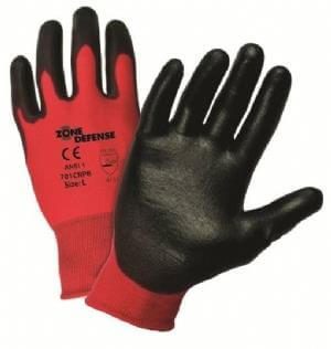 Zone Defense Red nylon shell with black PU palm coat for minimal cut protection and enhanced tactile sensitivity and excellent dexterity.