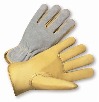 Select grain cowhide leather palm split cowhide leather back driver glove. Flexible keystone thumb construction. Clean self hem cuff. Shirred elastic wrist helps keep dirt and debris from entering the glove.