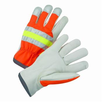 Premium grain cowhide leather hi-visibility driver gloves. Shirred elastic wrist for a snug fit and helps keep dirt and debris out of the glove. Hi-visibility orange nylon back with lime green accents. 3M Scotchlite reflective silver fabric on back of hand.