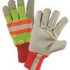 Premium grain pigskin leather palm glove with safety yellow back. Reflective material across cuff and knuckle provides excellent visibility in darkness and low-light conditions. Rubberized safety cuff.